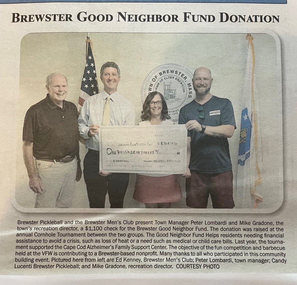 The Brewster Men’s Club and the Brewster Pickleball Group met again on August 3, 2024 for a competitive and fun set of cornhole games. They raised $1,100 dollars which was donated to the Brewster Good Neighbor Fund. A good time was had by all. This picture was in the Cape Cod Chronicle, Aug 22 2024.